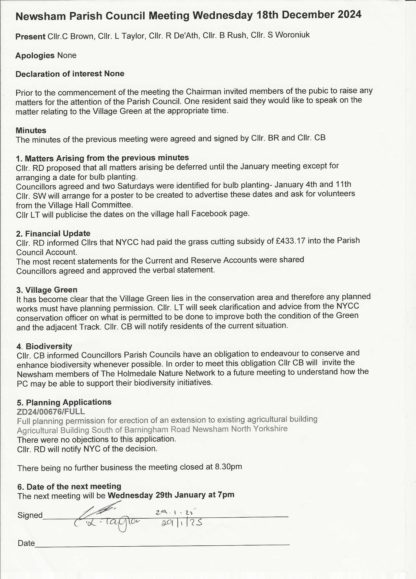 Newsham Parish Council meet up to six times per year, generally on the last Wednesday of alternate months.